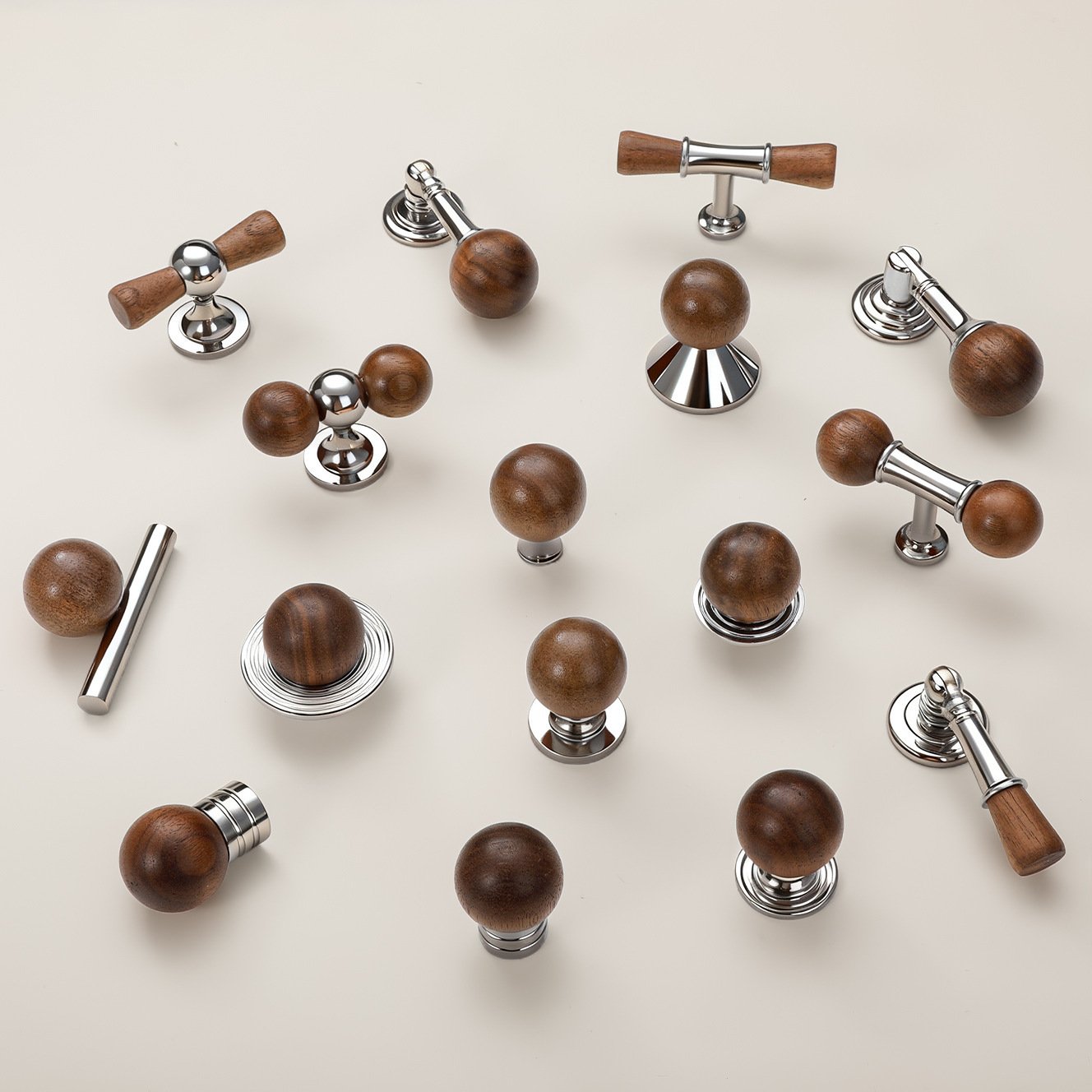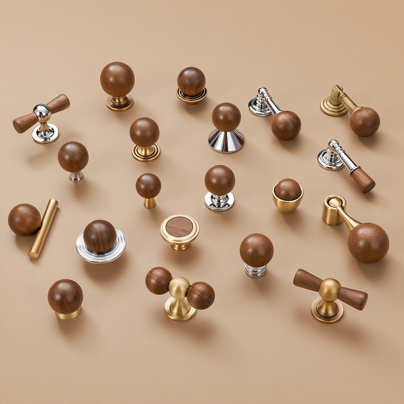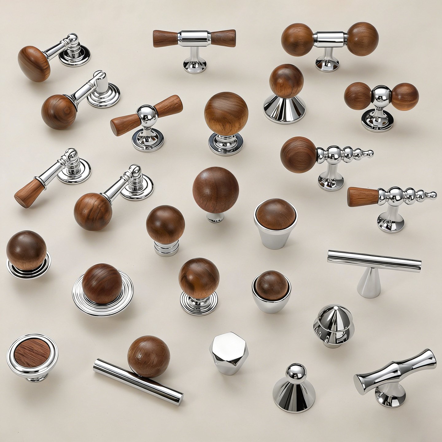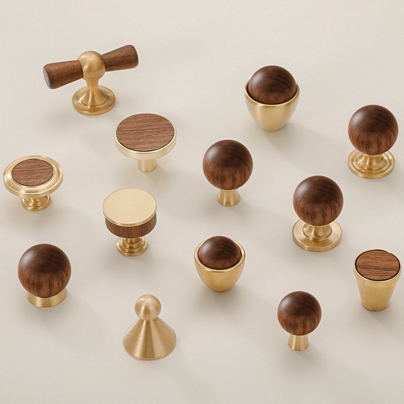 Explore our comprehensive selection of premium cabinet hardware, designed to complement every interior style, from classic to contemporary. This versatile collection includes three distinct looks: highly polished chrome pulls with an ornate, traditional European aesthetic; modern knobs and handles combining rich, warm-toned wood spheres with sleek chrome accents; and minimalist elliptical knobs in a sophisticated, matte brushed brass finish. Whether you seek the timeless elegance of ornate metal, the organic warmth of wood, or the understated luxury of brass, our collection offers exceptional quality and design versatility to instantly elevate your kitchen, bath, or furniture.